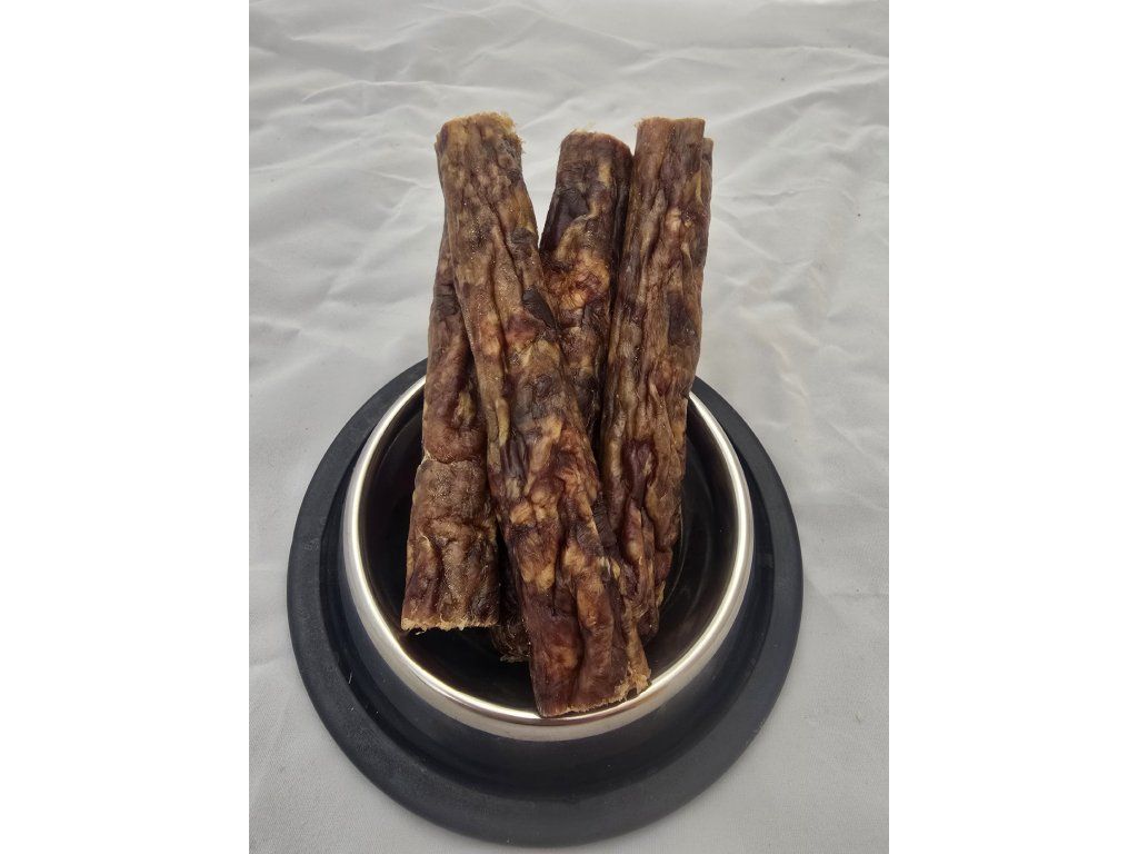 Pořádné sousto: Klobása má pevnější strukturu než párečky. Skvěle se hodí jako větší odměna po dlouhé procházce nebo jako motivační prvek, který se psovi dobře drží a kouše.