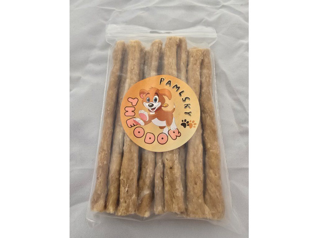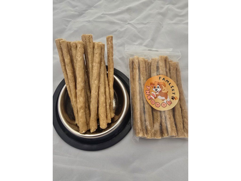 Méně je někdy více a u našich masových tyček to platí dvojnásob. Žádná střívka, žádná složitá aromata – jen poctivé vepřové maso doplněné o kapku kukuřičné mouky pro dokonalý tvar. Masové tyčky od Theodora jsou poctivou, sušenou odměnou pro psy, kteří milují přirozenou chuť masa.
